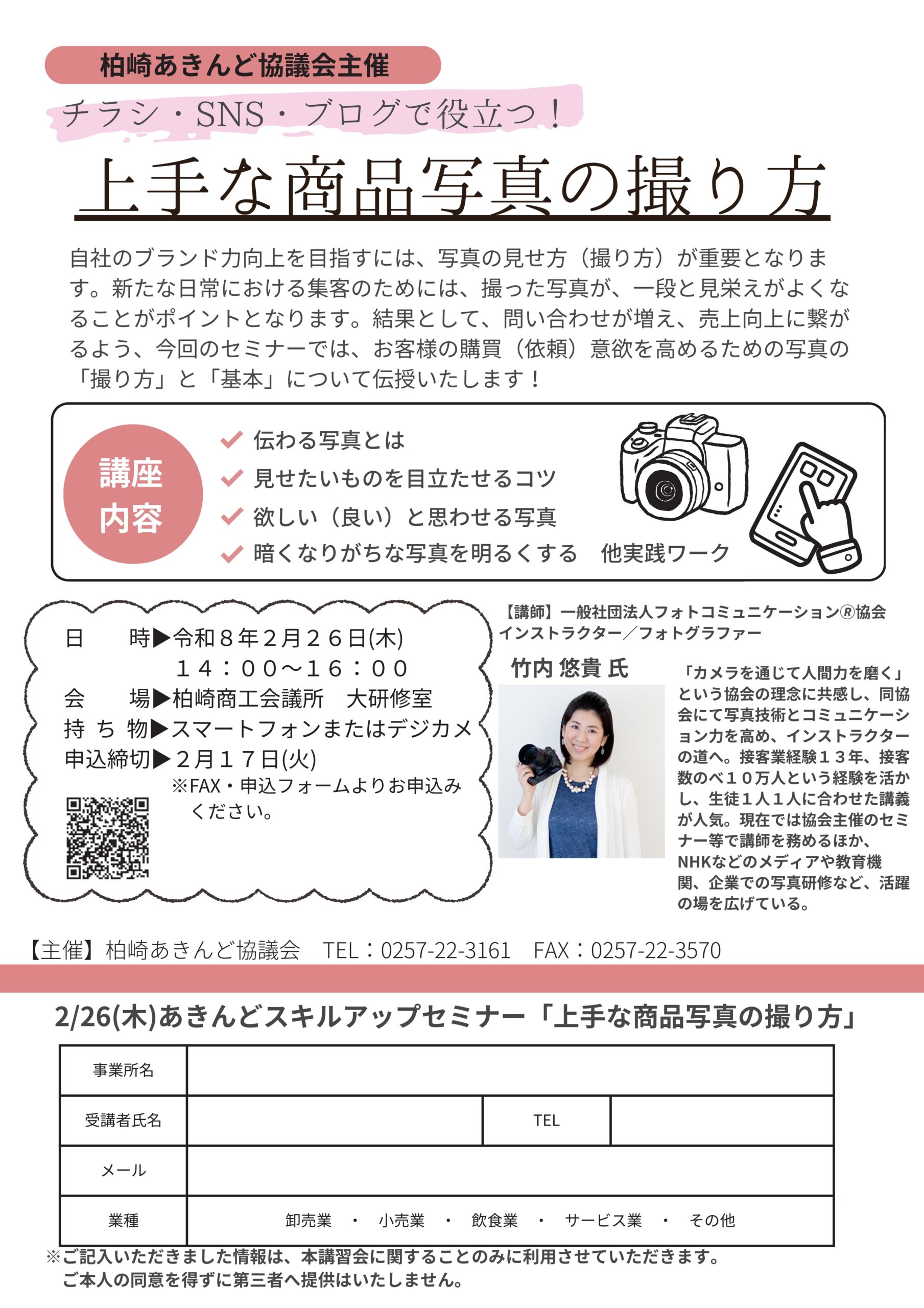 【柏崎あきんど協議会】スキルアップセミナー『売るために必要な話し方と動作』『上手な商品写真の撮り方』のご案内