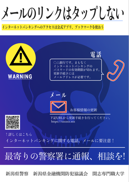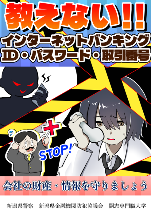 新潟県金融機関防犯協議会の御支援の下、開志専門職大学アニメ・マンガ学部と制作しておりました、インターネットバンキングに係る不正送金被害防止広報啓発用ポスターが完成いたしました。県内における令和7年のインターネットバンキングに係る不正送金被害は、4億3千万円を超え、前年比6倍以上に急増しており、広く注意喚起を実施しております。各作品のポスターをご確認ください。