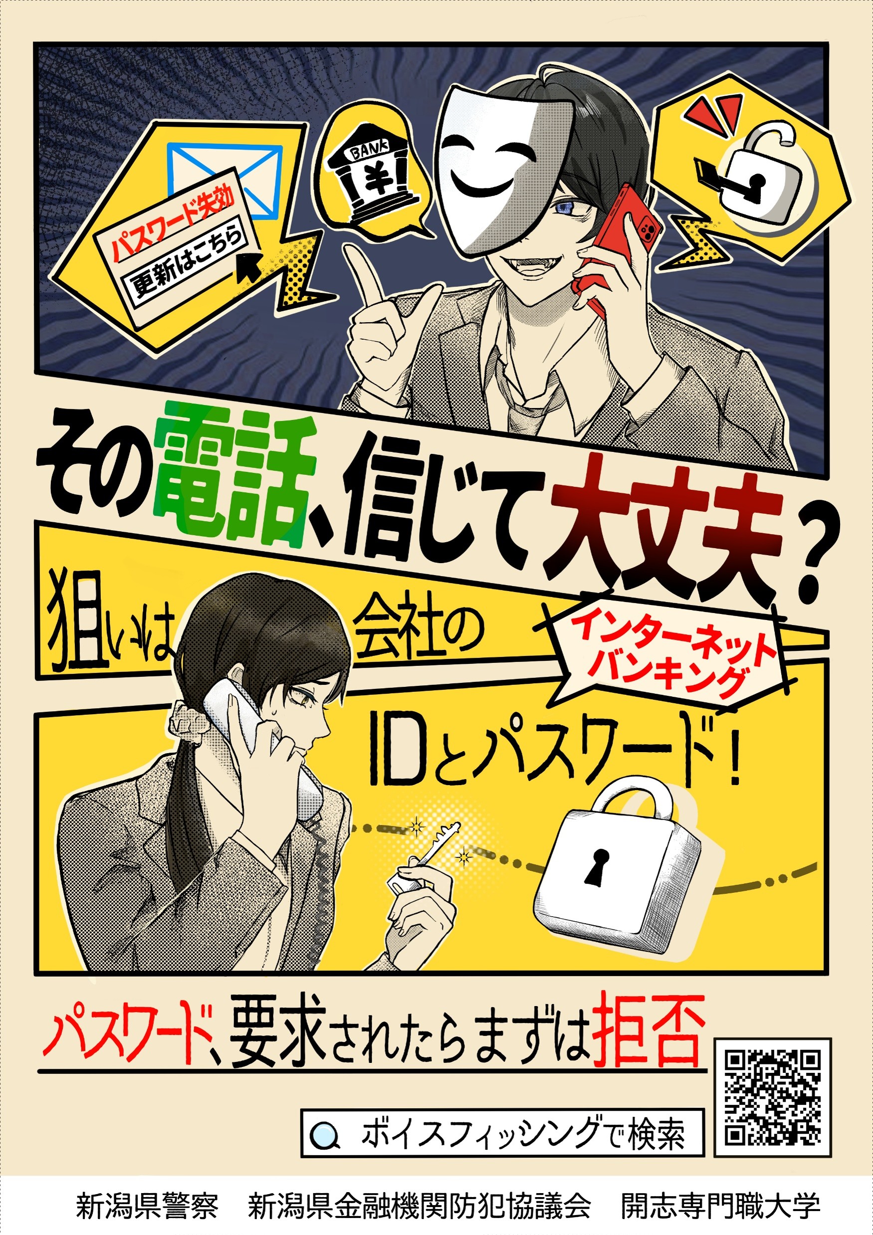 新潟県金融機関防犯協議会の御支援の下、開志専門職大学アニメ・マンガ学部と制作しておりました、インターネットバンキングに係る不正送金被害防止広報啓発用ポスターが完成いたしました。県内における令和7年のインターネットバンキングに係る不正送金被害は、4億3千万円を超え、前年比6倍以上に急増しており、広く注意喚起を実施しております。各作品のポスターをご確認ください。